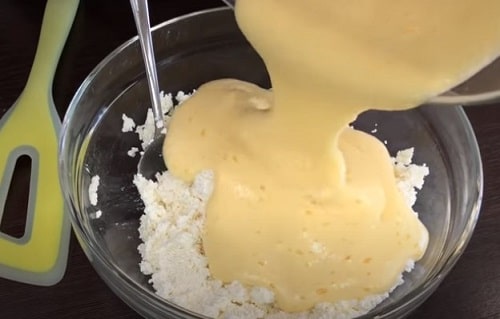 - Змішайте в мисці сир, згущене молоко, сіль, погашену соду. Розітріть масу.