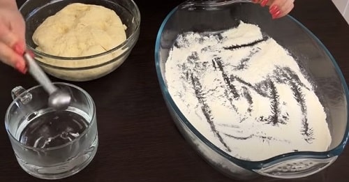 Припудріть тарілку або форму, як у моєму випадку, щоб сформовані заготовки пончиків не прилипали. Поруч поставте мисочку з водою. Вона стане в нагоді для змочування рук при ліпленні заготовок.