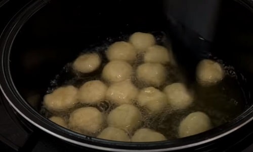 - Налийте в чашу мультиварки масло. Розігрійте до 160 про С. Складайте заготовки пончиків в чашу, обсмажуйте, не забуваючи перевертати. Про готовність підкаже збільшений розмір кульок і їх золотистий колір.