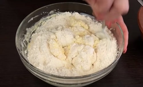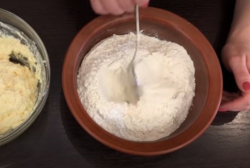 - В окремій посудині змішайте борошно з сиром, яйцем, сіллю. Розітріть до однорідного стану.