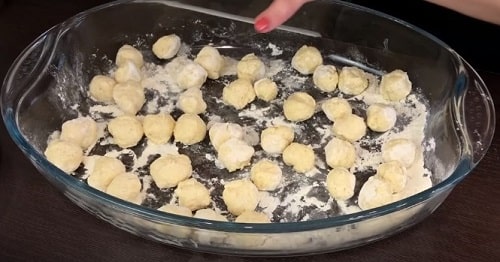 - Замісіть тісто. Зліпіть з нього колобки довільного розміру. Потім обваляйте їх в манній крупі.