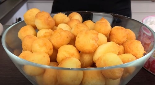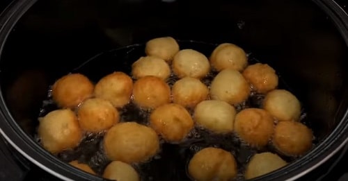 - Сформуйте заготовки-колобки будь-якого розміру. Смажте у великій кількості фритюру до апетитно рум’яного кольору.