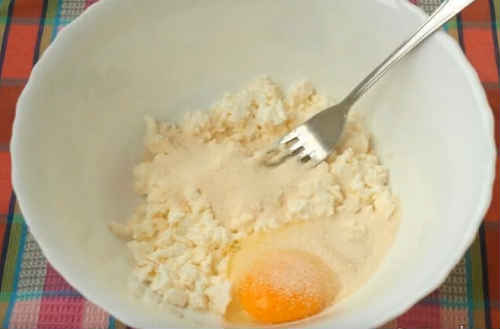 Розімніть виделкою, вбийте яйце, засипте манку. Сумлінно розітріть масу до однорідності.