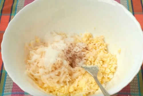 Додайте цукор, корицю, сіль. У яблука вдарите насінну частину, потріть на тертці з великими отворами. Введіть у суміш.