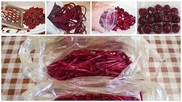 Як зберегти варений буряк в морозилці? Перед заморожуванням овоч очищають і нарізають дрібними кубиками. Можна натерти буряк на крупній тертці, але це менш бажаний спосіб, т. к. шматочки примерзають один до одного. Потім заготовку відкидають на сито і дають стекти зайвої рідини. Перед тим як прибрати в морозилку, нарізку розфасовують по пакетах або невеликим контейнерів.