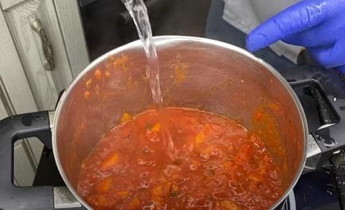 - Розведіть томатну пасту в воді, залийте овочі. Гасіть після закипання приблизно 20 хвилин. Простежте, щоб соус не википів повністю. При необхідності підлити ще води.
