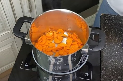 Хлюпніть масло в каструлю або глибоку сковороду, прожарити. Складіть нарізку моркви. Почніть обсмажувати до рум'яності на несильному вогні.