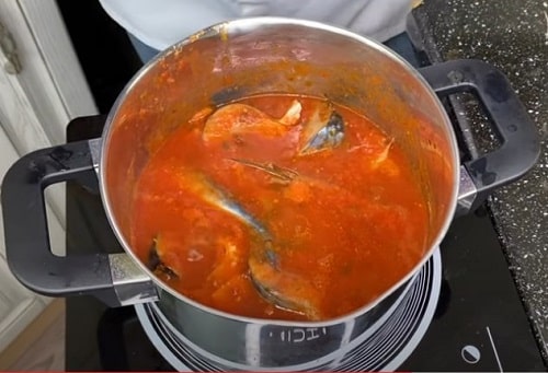 - Додайте томатну пасту, розмішайте. А при бульйон, викладіть шматочки скумбрії. Після закипання млоїте під кришкою не менше 20 хвилин.