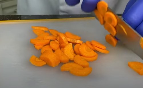 - Баклажани і морквину покришите кубиками середнього розміру. Лук подрібніть півкільцями. Солодкий перець настругати соломкою.
