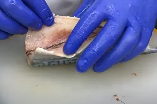 Одночасно займіться скумбрією. Раджу не розморожувати тушки риби повністю, оскільки в трохи замороженому вигляді вони легше потрошити. Відріжте голову, хвостову частину, плавники. Розріжте черевце. Витягніть нутрощі.
