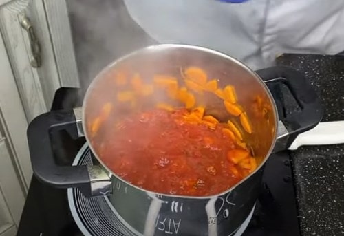 Коли морквина обжарится, додайте томати у власному соку. Тут є невеликий нюанс. Якщо в баночці цілі помідори, порубати їх кубиками, або пробийте блендером. Чи не знайдеться заповітної баночки, не турбуйтеся, беріть свіжі помідори або томатну пасту. В даному випадку доведеться збільшити кількість солі з цукром, корегуйте смак по ходу приготування.