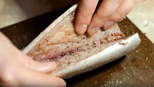 Щоб було легше і зручніше обробляти тушку риби, не розморожуйте її до кінця. Залиште її трохи підмороженого, тоді нутрощі не розмазуються по черевцю, дістаються відразу всі разом. Обов’язково видаляйте чорну плівку всередині черевця.