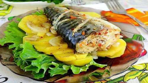 Скумбрія в духовці з лимоном і цибулею з картоплею