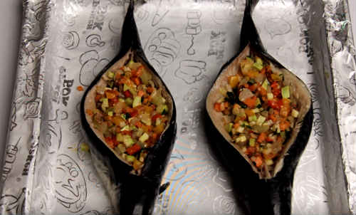 Фаршируйте скумбрію овочами.