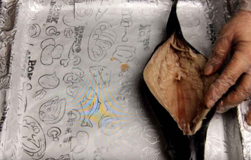 Скумбрію обробити. Раджу не чекати, коли вона розморозиться повністю, буде легше витягувати хребет. Голову не обрізайте, а ось зябра приберіть обов’язково. Зробіть надріз на спинці, витягнути нутрощі, хребет і кісточки. Промийте тушку, обсушіть. Посипте в черевце трохи солі і перцю.
