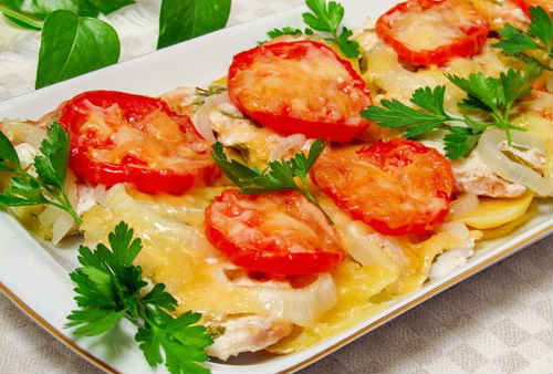 Смачне м’ясо по-французьки з свинини з картоплею, помідорами, грибами та сиром