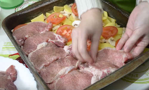 - За винятком запікання з картоплею, м’ясо завжди укладається знизу. Його подають, прихопивши за стейк, не порушуючи верхні шари.