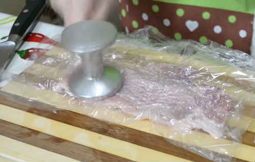 Накрийте шматочки харчовою плівкою, сумлінно відбийте молоточком, щоб волокна стали м’якшими. Накрийте плівкою обов’язково, інакше обрызгаетесь.