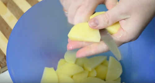 Наріжте картоплю пластинами, кружечками. Не мельчите, інакше в готовому блюді овоч загубиться.