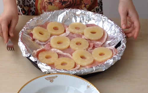 Злийте сироп з банки з ананасами, на кожен ескалоп покладіть фруктовим колечку.