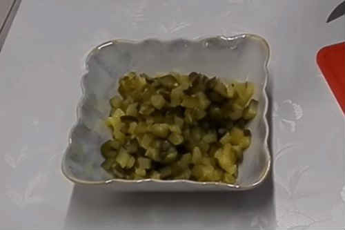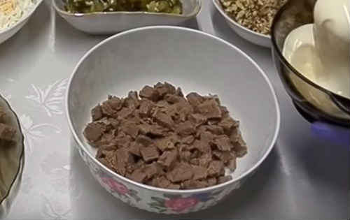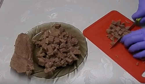 - Відваріть м’ясо в підсоленій воді, після остигання покришіть кубиками середнього розміру.