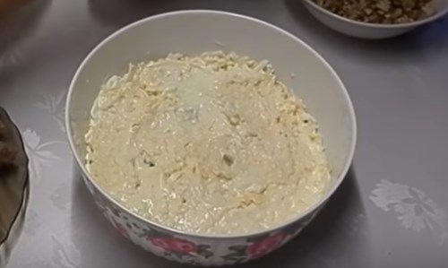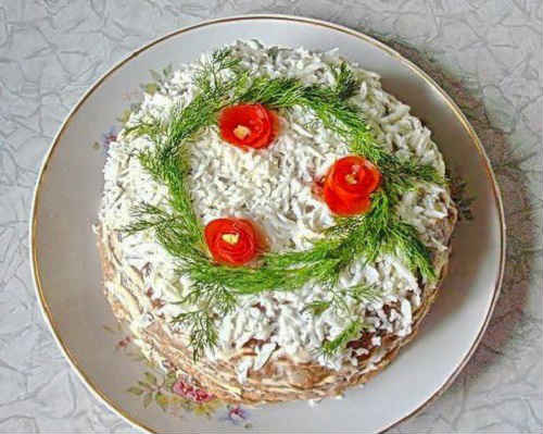 Останній шар яєць пролийте майонезом особливо щедро. Потім розсипте поверх подрібнені горіхи, і прикрасьте на свій розсуд.