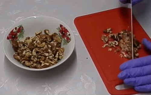 Підсушіть ядра горіхів на сковороді або в мікрохвильовій печі. порубаєте їх ножем, але сильно не мельчите, інакше у страві вони загубляться.