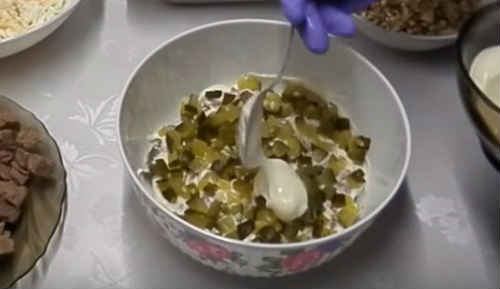 Наріжте огірочки дрібними кубиками, обов’язково відіжміть нарізку, щоб злити зайвий розсіл. Якщо залишити, то салат може «попливти».