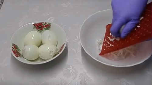 - Розкидайте яйця, трохи примніть шар. Намалюйте сітку майонезу.