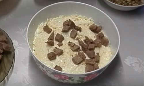 - Остудіть продукти, грудку наріжте шматочками. Яйця і картоплю потріть великої стружкою.