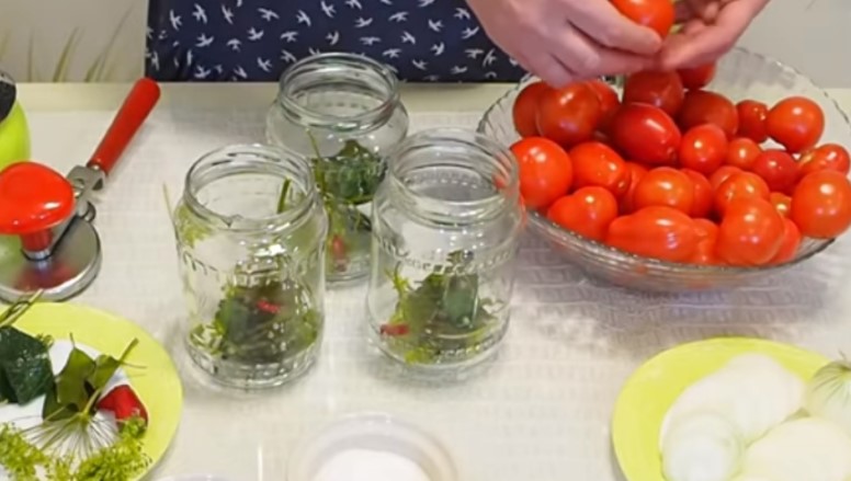 3. Далі викладаємо томати, заповнюючи пустоти цибулею. Щоб плоди лягли щільніше, потрібно періодично струшувати тару. Зверху кладемо гілочку зелені.