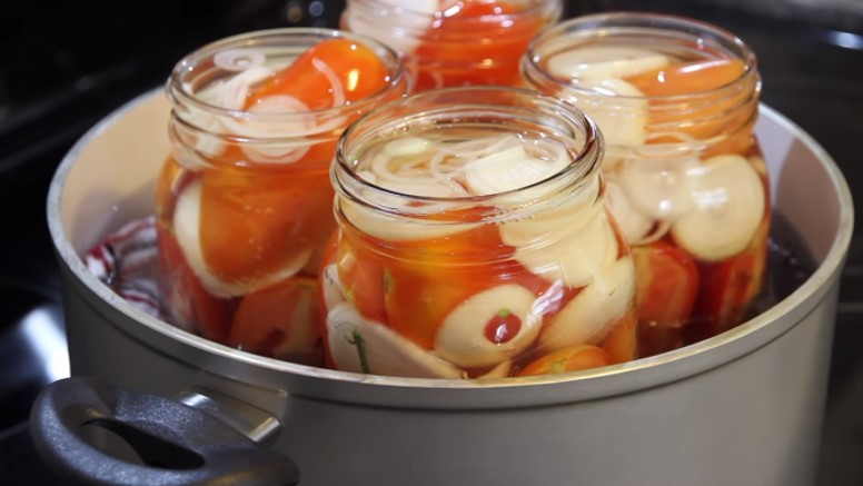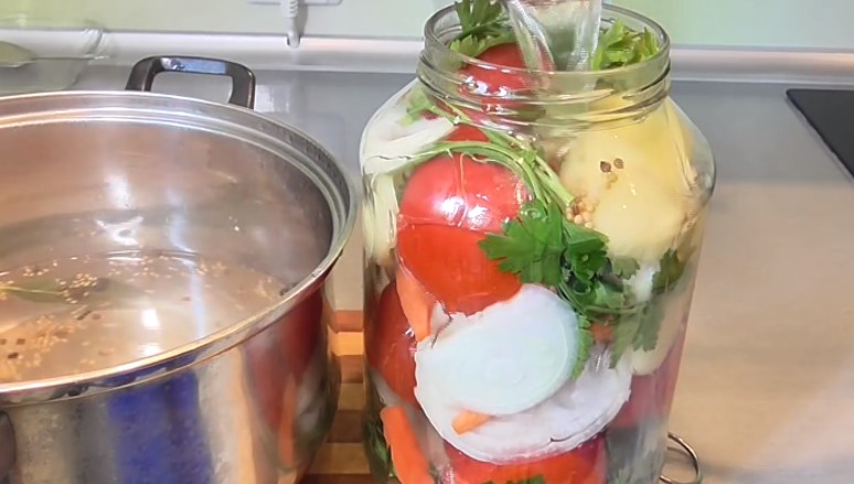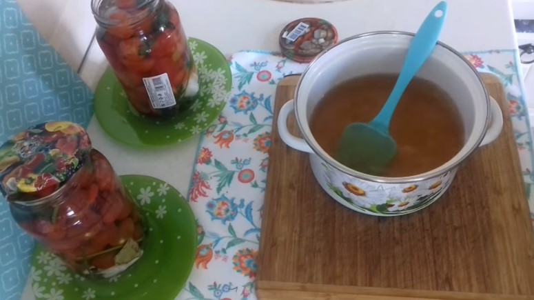 6. З банок зливаємо воду, заливаємо овочі желатиновим розсолом. Заповнену склотару прикриваємо і ставимо для стерилізації на 20 хвилин.