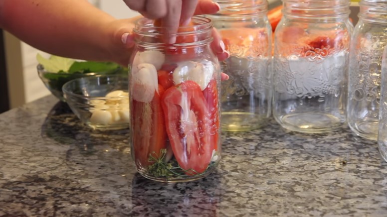 2. Далі приступаємо до нанесення томатів. Для цього плід розрізаємо на четвертинки, вирізаємо плодоніжку. Для краси чергуємо шарами різні кольори помідор. Я взяла жовті, зелені (бурі) і червоні. Ви ж можете створити свій власний мікс. Коду склотара заповниться на половину, засипаємо сухий желатин.