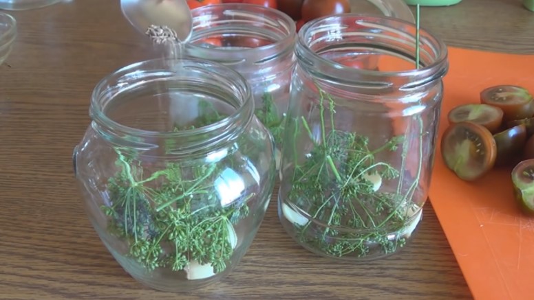 1. На дно літрової склотари кидаємо зелень петрушки, кількість якої кожен визначає сам, від 3 до 5 листя базиліка, половину цибулини, листочок лавра.