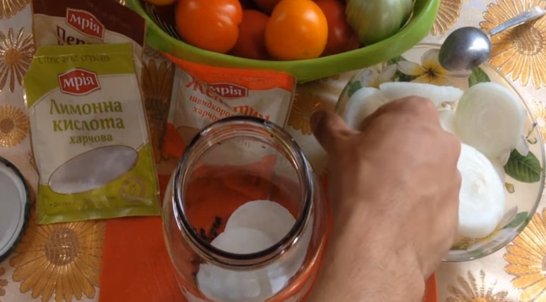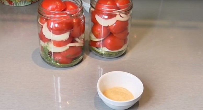 5. Банки заповнюються вщерть, чергуючи шари з цибулі та томатів. Желатин розбавляється теплою водою і залишають для набухання.