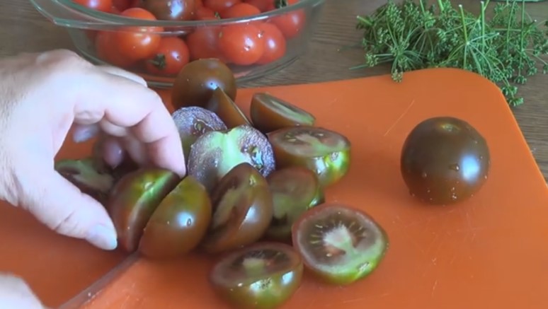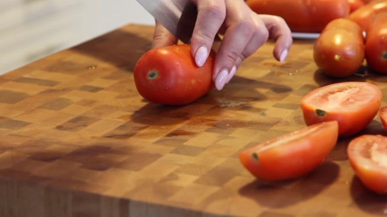 2. Для цього рецепта можна використовувати абсолютно будь-які плоди, але мені подобається саме сорт «сливка». Помідори миємо й розрізаємо вздовж за допомогою гострого ножа, плодоніжку не видаляємо.
