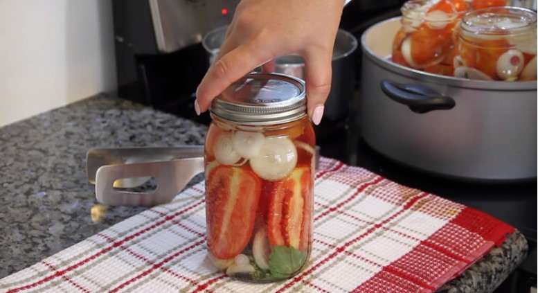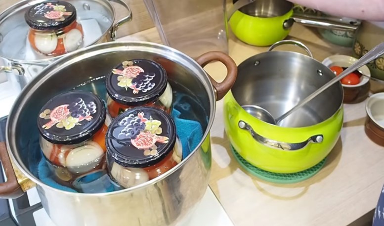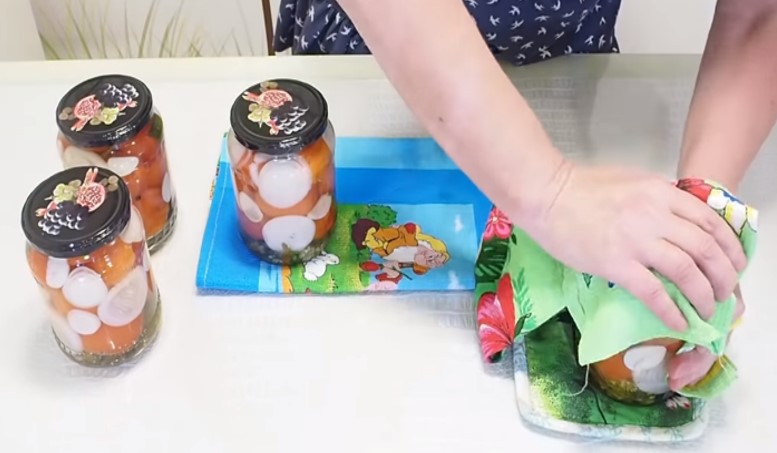 8. У готової закуски кришки щільно закручуються, склотара перевертається і забирається під пухову ковдру на добу.