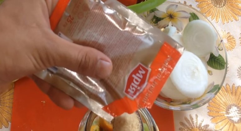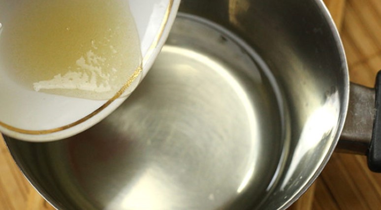6. Вода наливається в ємність і ставиться на варильну поверхню, кладуть цукор і сіль, доводять до кипіння. Потім додається желирующая маса, розсіл швидко розмішується, поки остання крихта не розчиниться, додається оцет і знімається з полум’я.