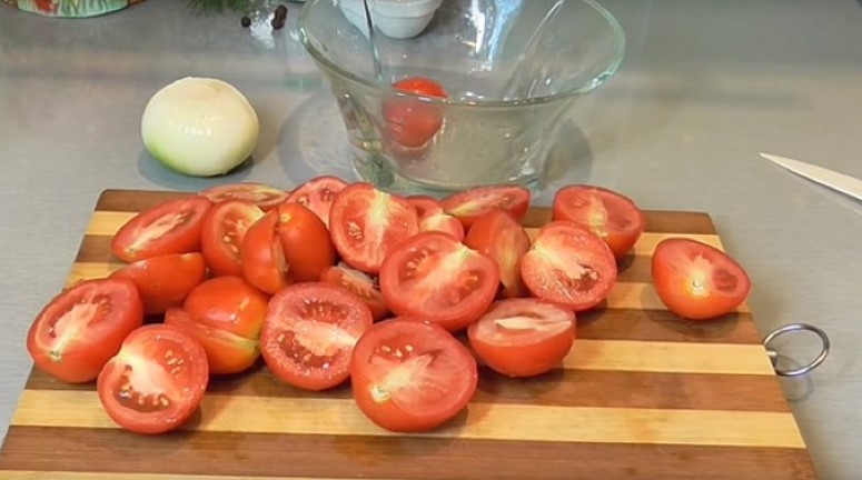 1. Плоди ретельно переглядаємо, відбираючи тільки цільні пружні помідори, без видимих слідів псування. Потім їх ретельно миємо, і робимо невеликий прокол у районі плодоніжки.