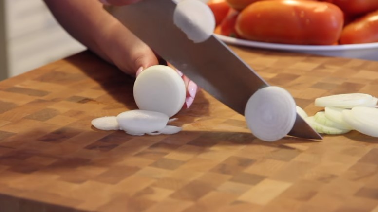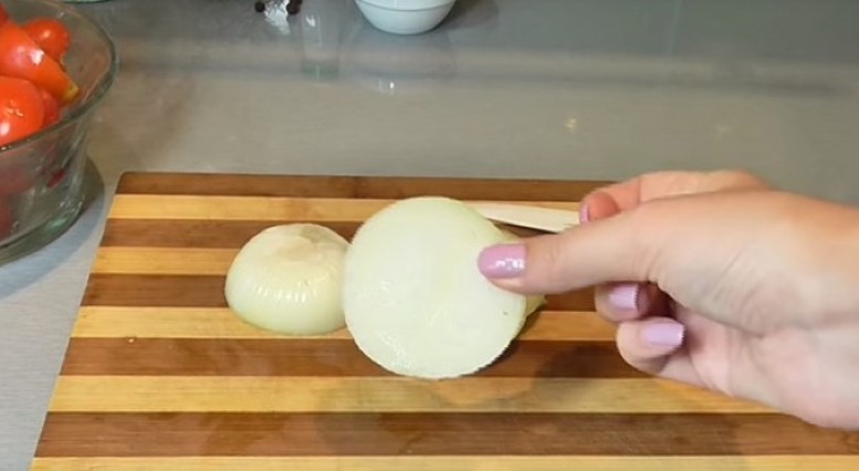 2. Очищені цибулини середнього розміру нарізати тонкими пластинками.