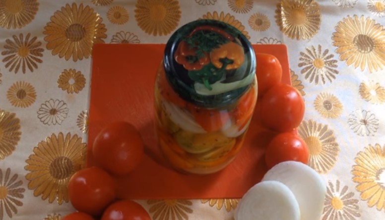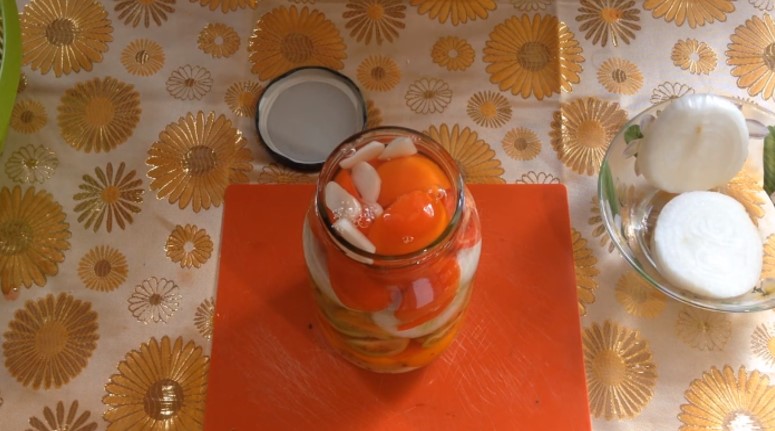 Різнокольорові шматочки плодів з цибульними кільцями в ароматному желированном розсолі виглядають настільки ефектно, що мало хто відмовиться від такої смачної закуски.