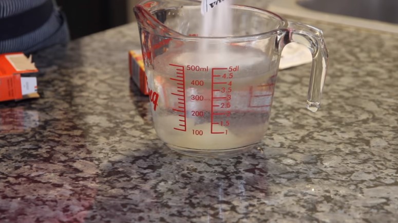 5. У ємності кип’ятимо півлітра води, розчиняємо в ній сіль і пісок, варимо близько двох хвилин, відключаємо газ і вливаємо желатинову масу. Суміш перемішуємо.