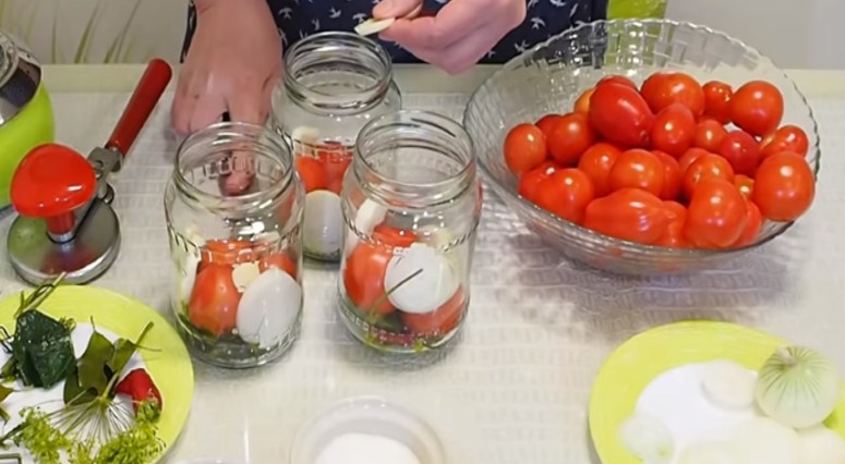5. У ретельно вимиту і ошпарену окропом склотару кладемо 6 горошин перцю, кроповий парасолька, 2 часточки часнику, лист смородини і кілька цибулевих гуртків. Далі впритул викладаємо половинки плодів, чергуючи їх з цибулею. Наповнюючи банки під горлечко.