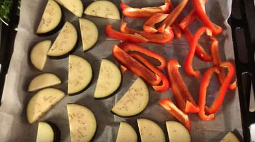 Постеліть на деко лист пекарської папери, розкладіть овочі. Відправте в духовку запікатися на 10-15 хвилин. Температурний режим у печі 180 про С.