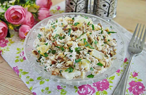 Чудова версія для святкового салату з ананасами, яблуками, волоськими горіхами.