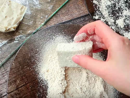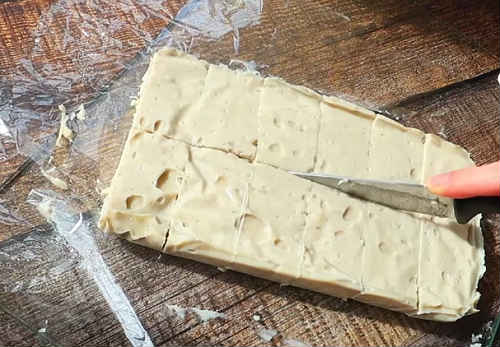 Крем стане щільним, пружним. Наріжте його на шматочки порціями.