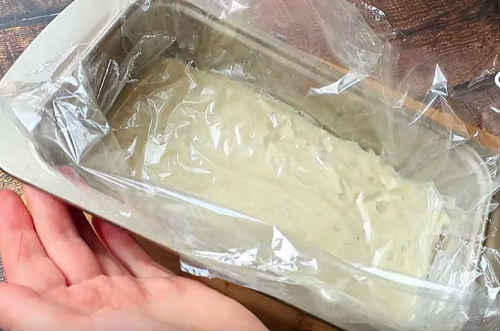 Застеліть форму харчовою плівкою, перекладіть масу, не охолоджуючи, розрівняйте. Накрийте іншим шаром плівки, щільно притиснувши її до тесту.
