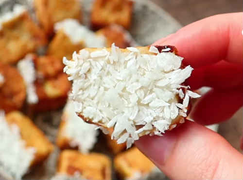 Щоб видалити жирність, а з нею і зайві калорії, спочатку викладіть смажені шматочки на паперову серветку. Потім, знявши надлишок масла, перекладіть на тарілку. Розріжте молоко навпіл, умочіть кінчик в кокосову стружку (як варіант підійде кориця, цукрова пудра, мак).