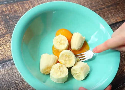 Паралельно з яєць відокремте жовтки, викладіть в миску. Наріжте колечками банан, додайте до жовтків.