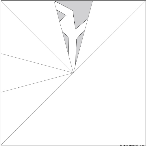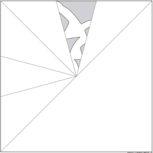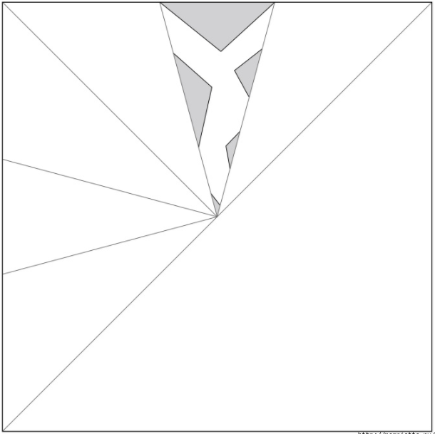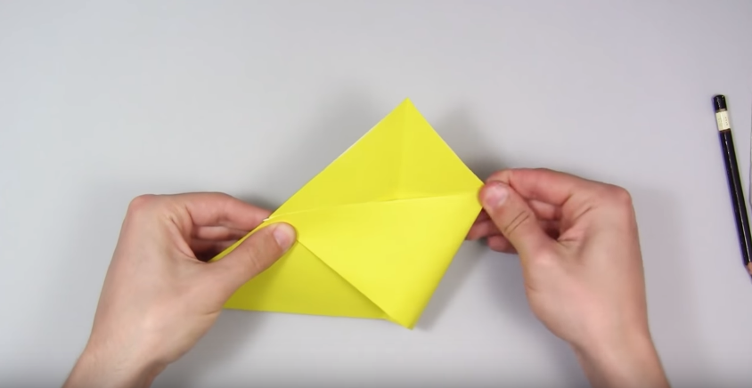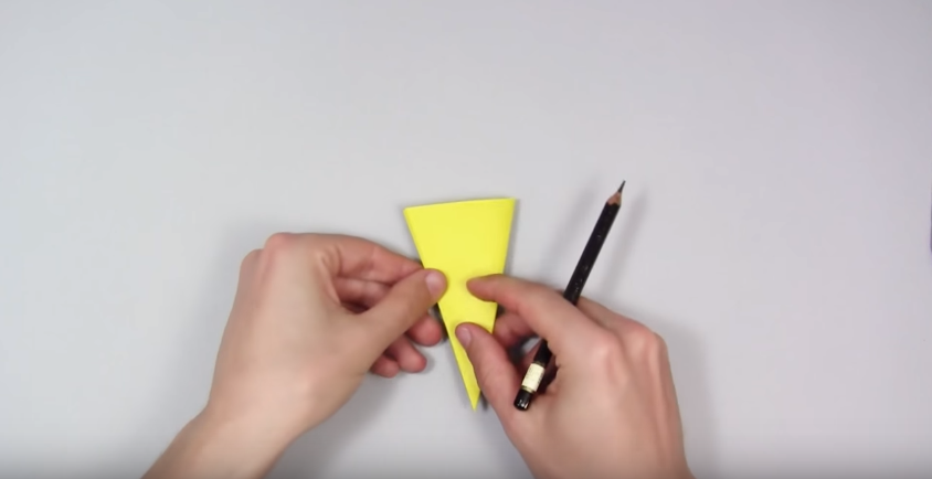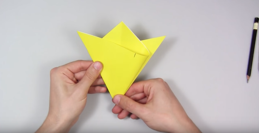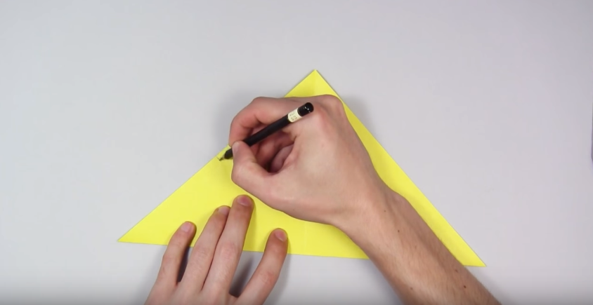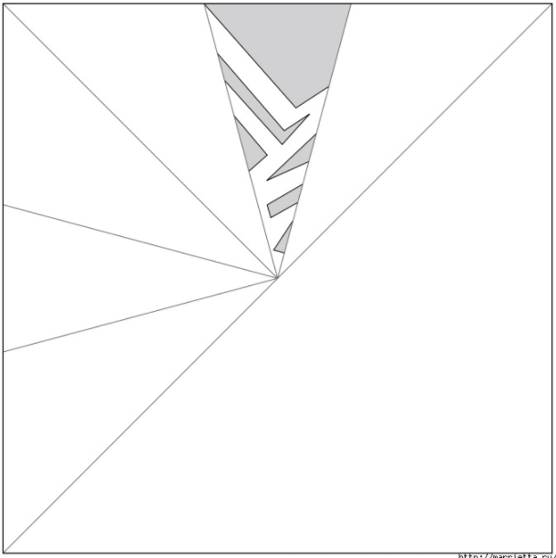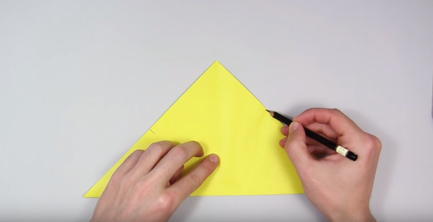 8. Складаємо правий край так, як показано на фото. Щоб нижній згин проходив по середині нижньої лінії трикутника (по медіані, якщо ви пам’ятаєте геометрію), а верхній – з поставленої олівцем крапці.